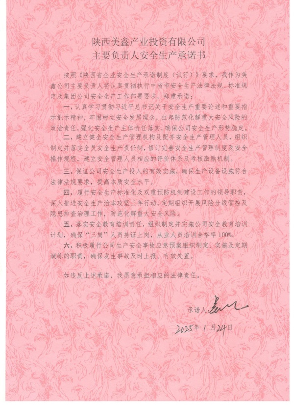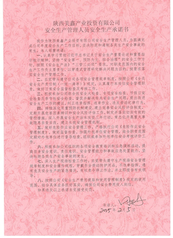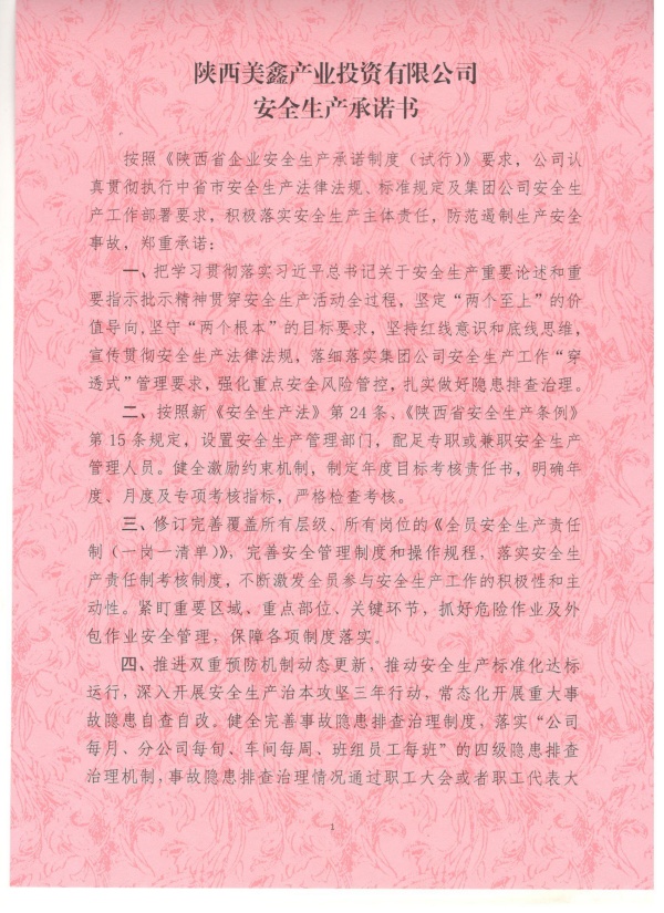 陜西美鑫產(chǎn)業(yè)投資有限公司安全生產(chǎn)承諾